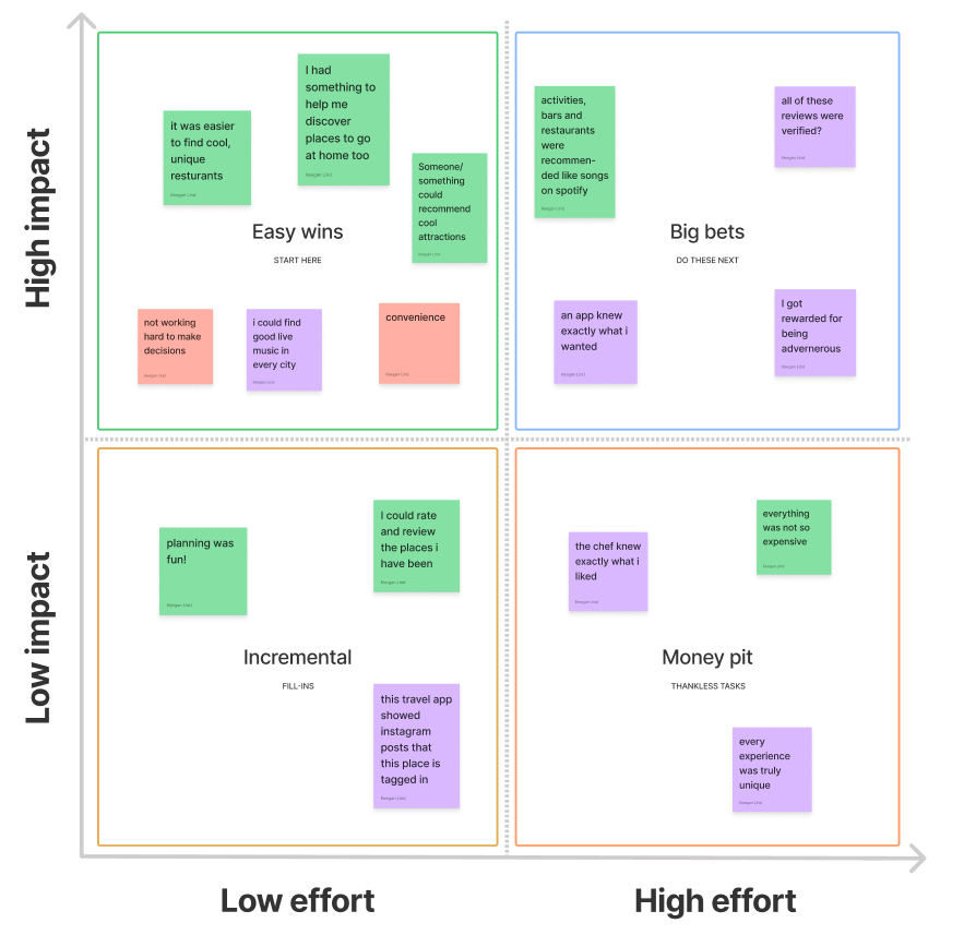 When considering prioritizing features, we used data synthesised by our surveys, personas, and "I like, I wish, What if" matrices to identify important features. We took these features and organized them based on importance and doability.
